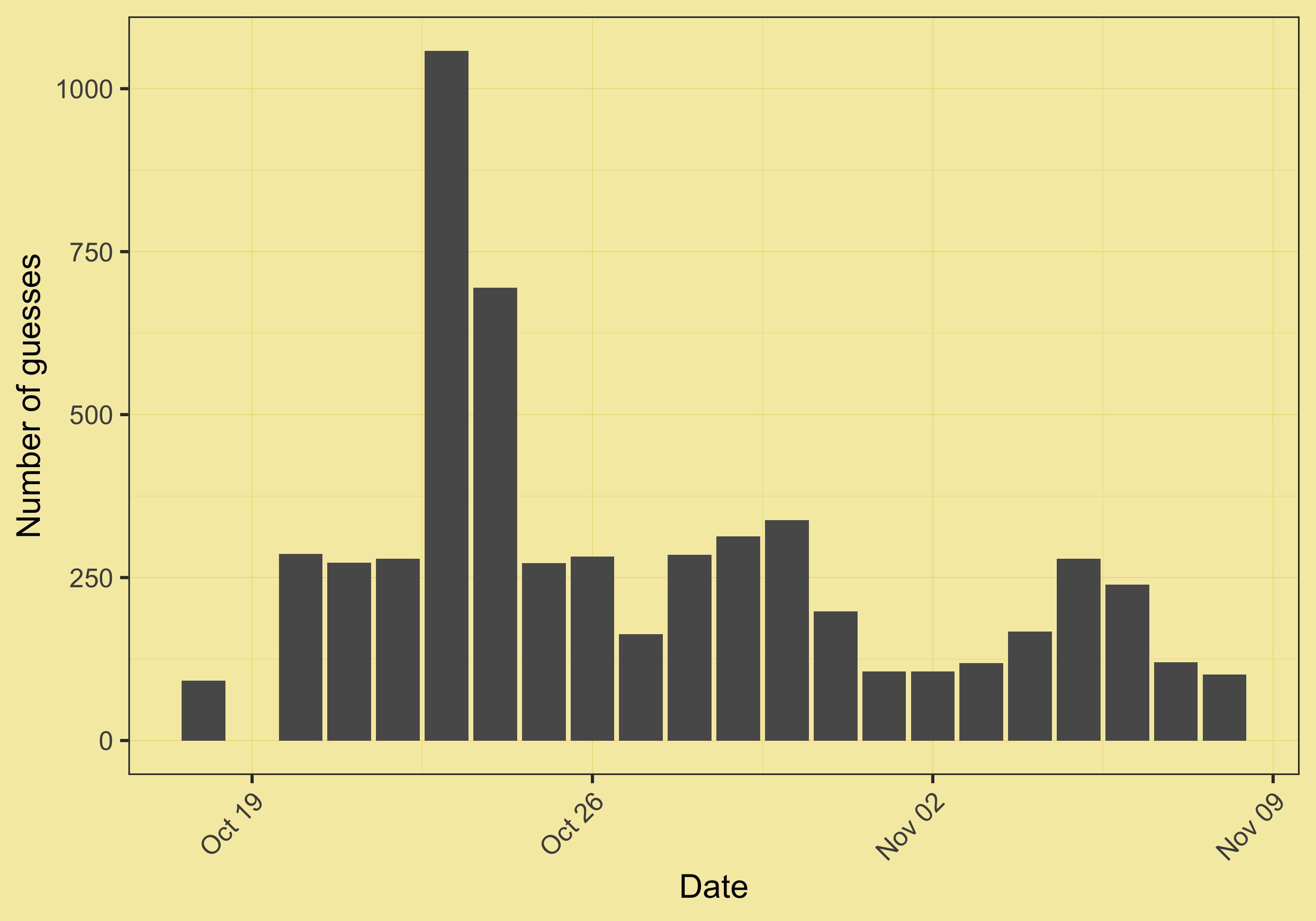 The interest peaked on October 23, with more than a thousand guesses for that day (I think it was reposted by someone with a significant outreach back then), and has been slowly declining since.