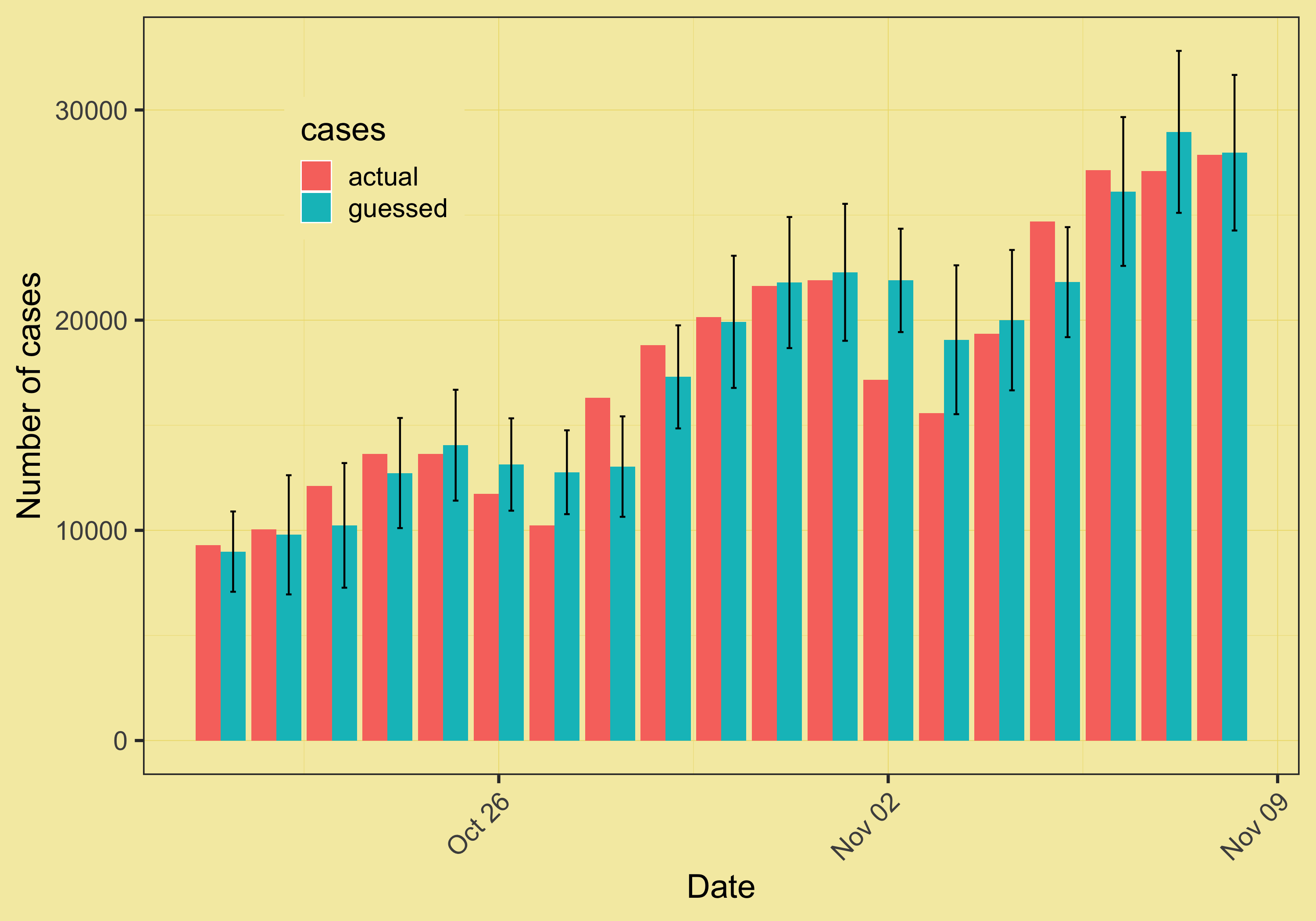 People have over- and underguesstimated the number of new cases, but not by much. There were only a few occasions where the actual case count didn’t fall within one standard deviation of the mean of guesses (represented by the whiskers around blue bars on the plot). Granted, the daily standard deviation tends to be large (on the order of a few thousand), but still, I’m impressed. A paper on estimating the growth of pandemic based on coronalottery results coming soon to a journal near you! ;-)