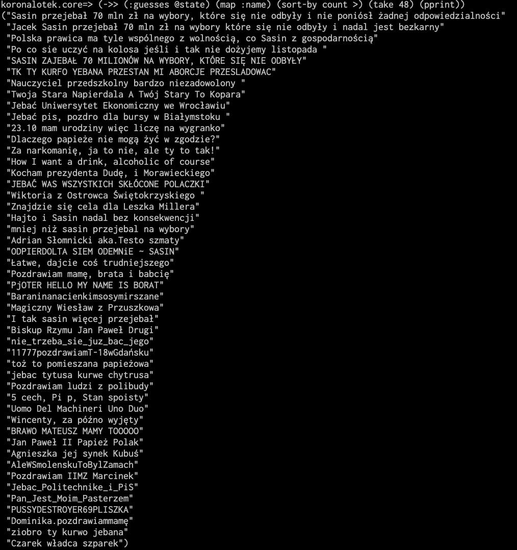 I doled out $4 for a domain, koronalotek.pl (can be translated as “coronalotto” or “coronalottery” – occurrences of the name on Twitter date back at least as far as April), and fired up a REPL. A few hours and 250 Clojure LOCs later, the site was up.