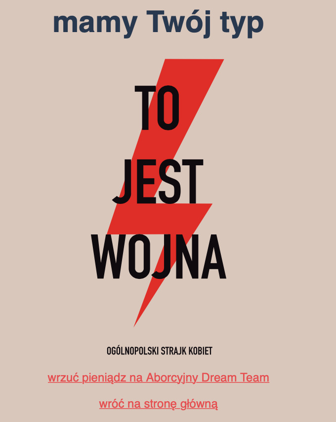 In fact, I have taken the liberty of chiming in. Shortly after, I altered the thank-you page (which used to just say “thanks for guessing”) to proudly display one of the emblems of the Women’s Strike, along with a link to a crowdfounding campaign for an NGO that supports women needing abortion.