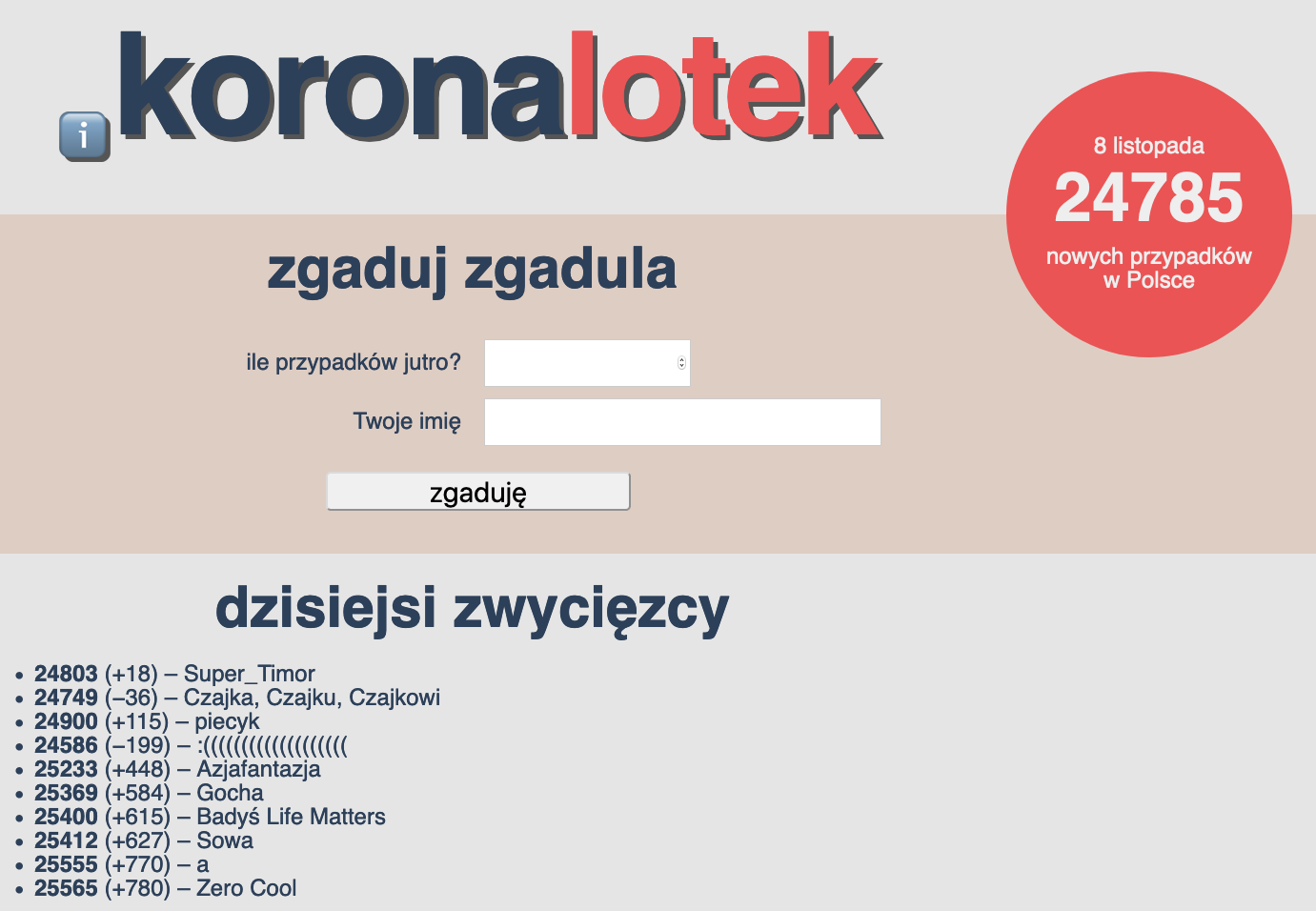 I wanted it to be as simple as possible. A form with two fields: “your name” and “how many cases tomorrow?” A top-ten list of today’s winners, sorted by the absolute difference between the guess and the actual number of cases, as reported daily on Twitter by the Polish Ministry of Health. The official number, prominently displayed. And that’s all.